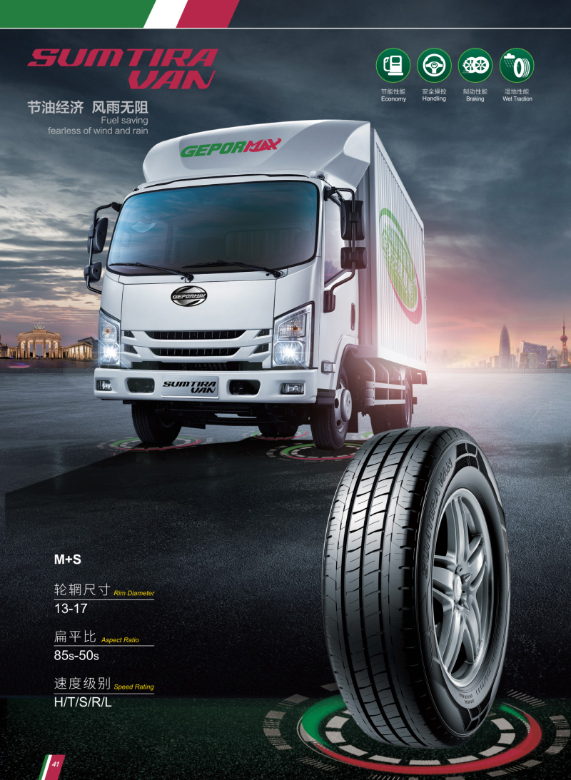 SUMTIRA VAN 輕型商用車(chē)用輪胎,獨特的花紋溝,深排水槽,有較好的排水性和經(jīng)濟燃油性。