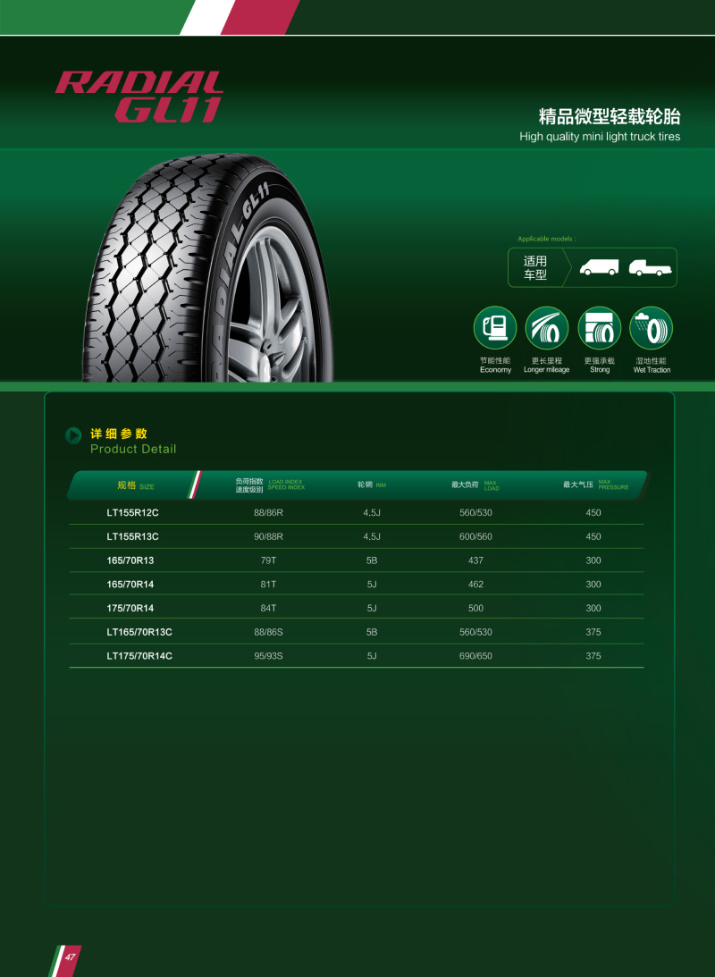 RADIAL GL11 精品輕載輪胎,高強胎體結構,承載力更強,耐磨橡膠配方和加深花紋,更高的使用壽命。